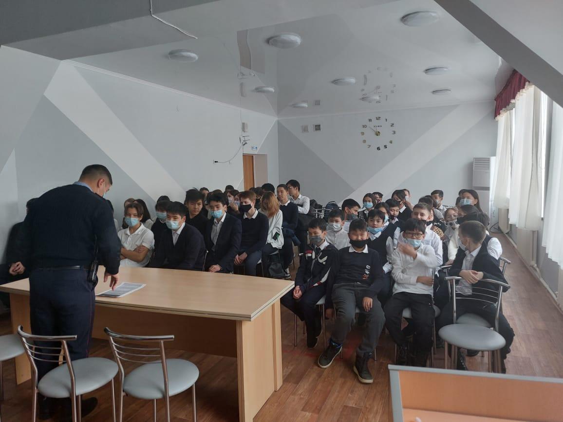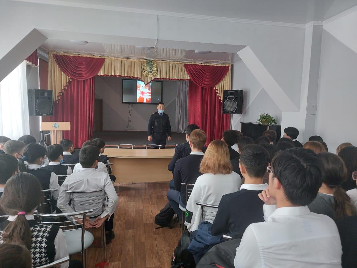 Инспектор по делам несовершеннолетних капитан полиции Керімбай Бақтияр Мұратұлы провел беседу с учащимися гимназии на тему «Профилактика правонарушений, профилактика курения электронных сигарет и ПАВ»
