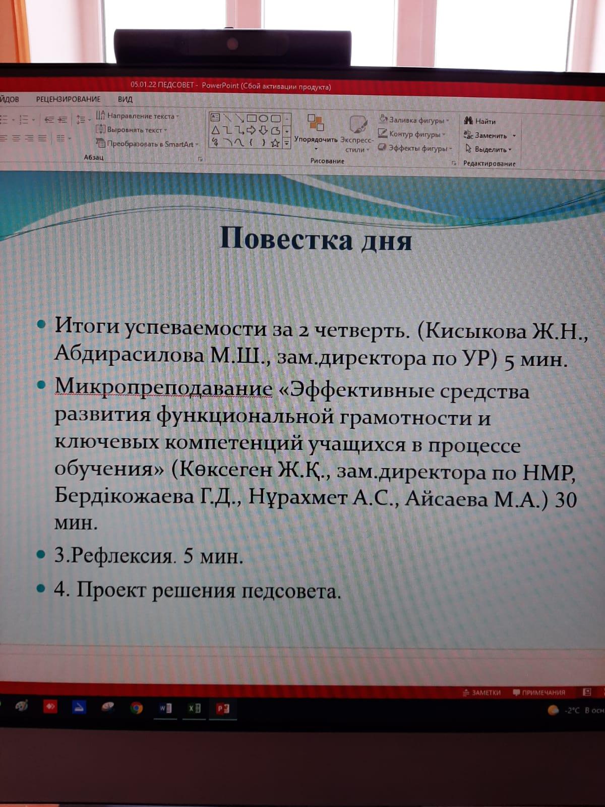 Сегодня в гимназии прошёл педагогический совет. На педсовете рассматривались итоги успеваемости учащихся за вторую четверть, выступили зам.директора по УР Абдирасилова М.Ш и Кисыкова Ж.Н. Также было рассмотрено Микропреподование "Эффективные средства развития функциональной грамотности и ключевых компетенции среди учащихся в процессе обучения", выступили зам.директора по НМР Коксеген учитель географии Айсаева М.А, учитель английского языка Нұрахмет А.С и учитель казахского языка Бердікожаева Г.Д. Также были рассмотрены вопросы по обучению во время ЧП и осложнения санитарно- эпидемиологической ситуации в городе Алматы.