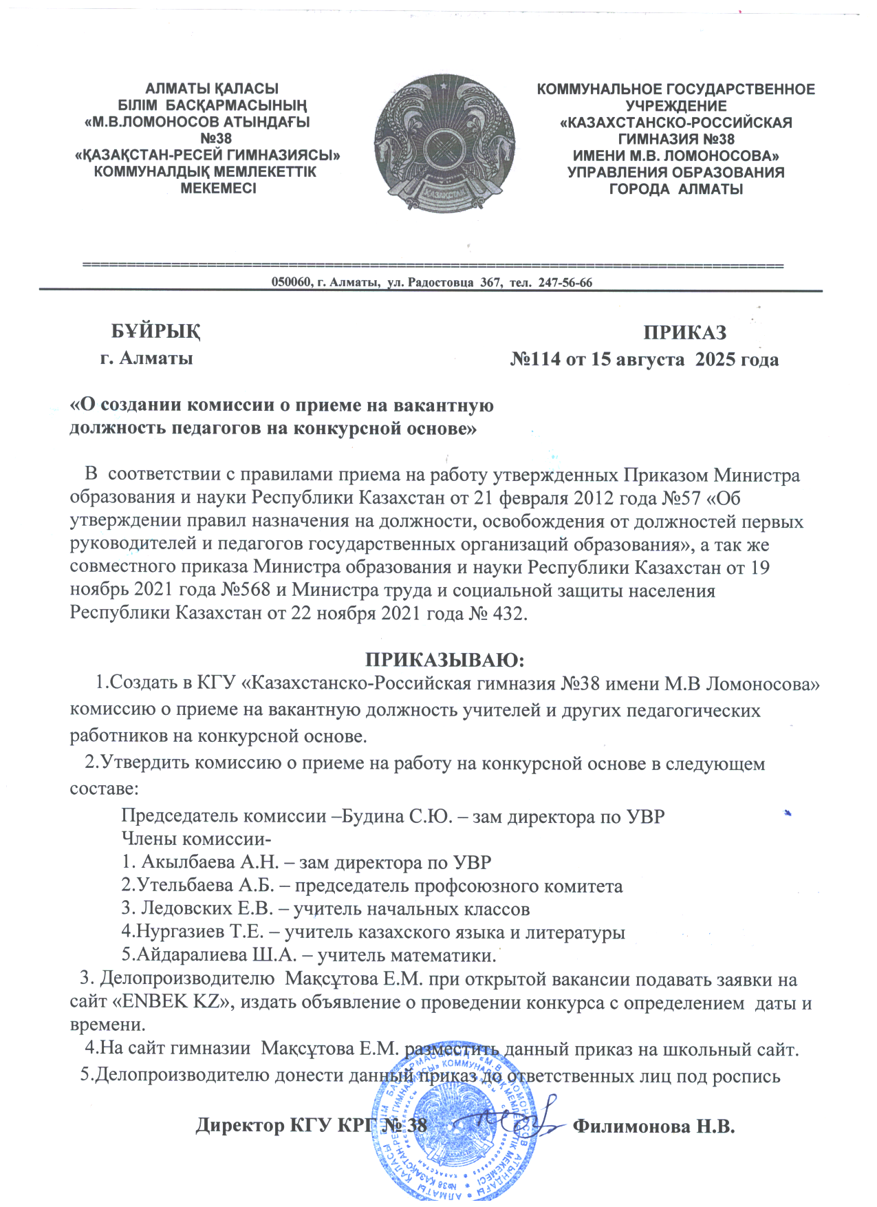 15 тамыз 2025 0 1 2 3 4 5 Педагогтарды бос лауазымға конкурс негізінде қабылдау жөніндегі комиссияны құру туралы