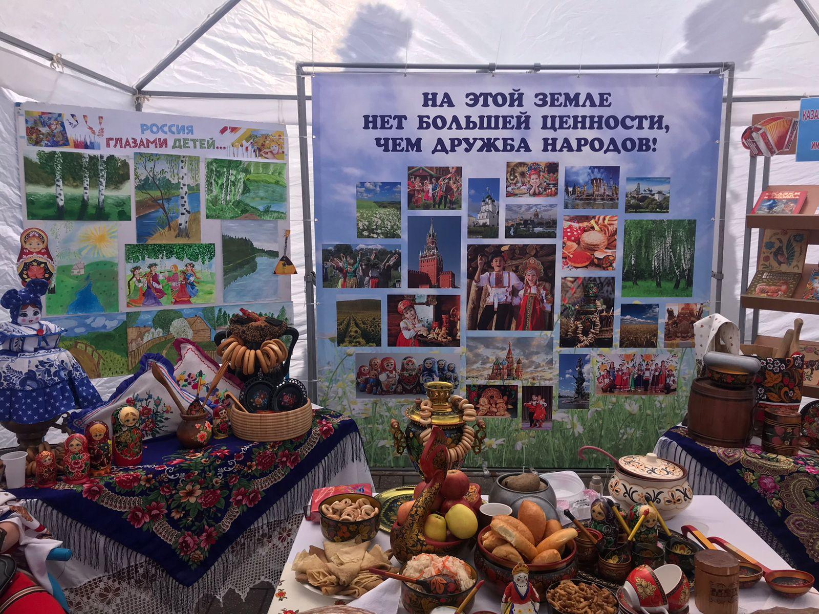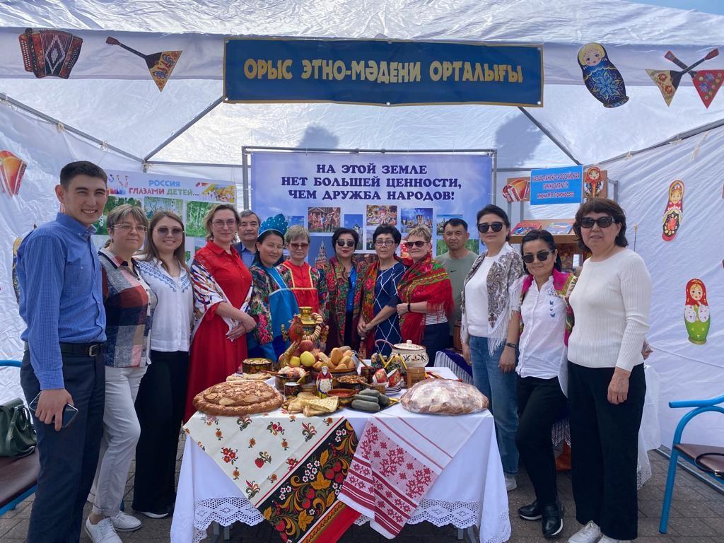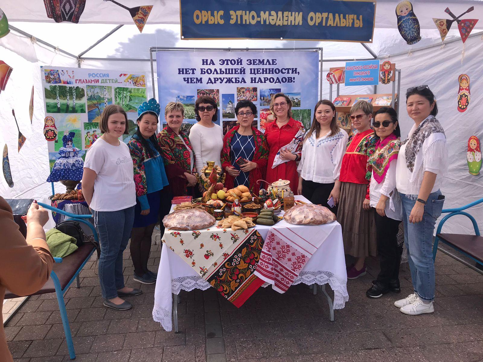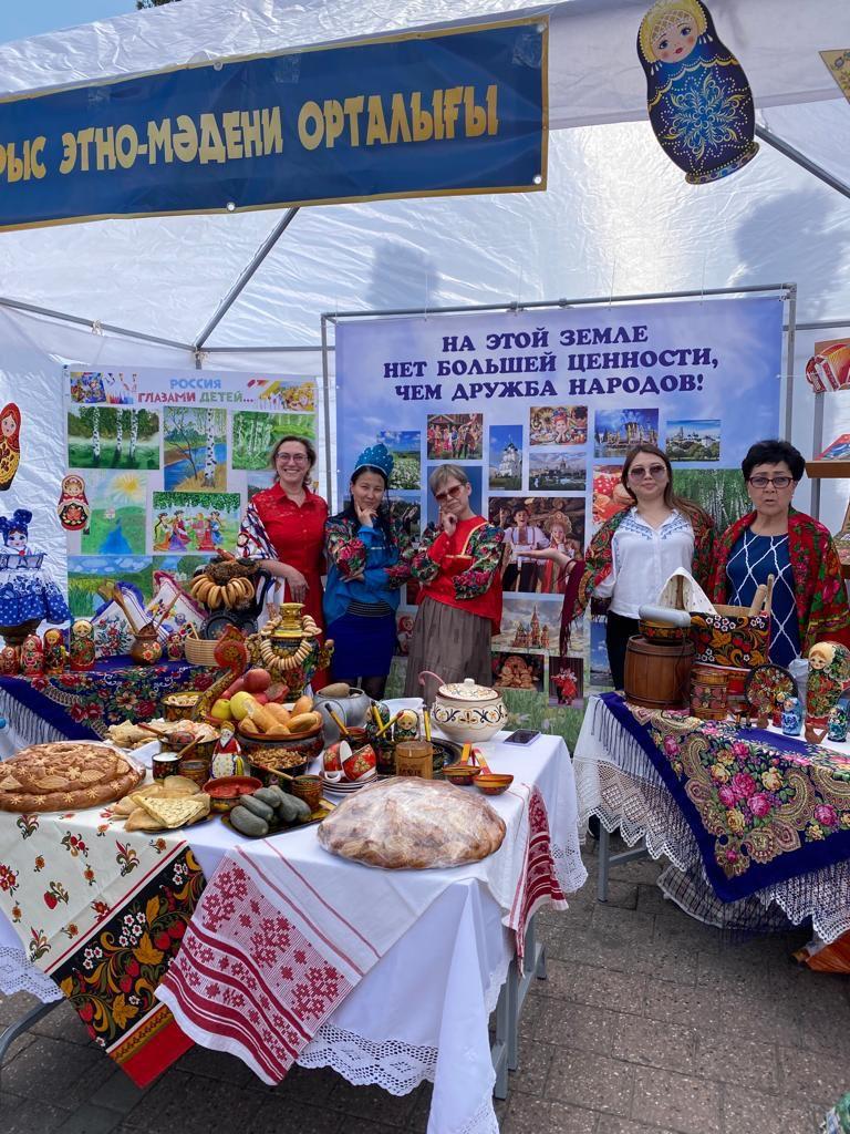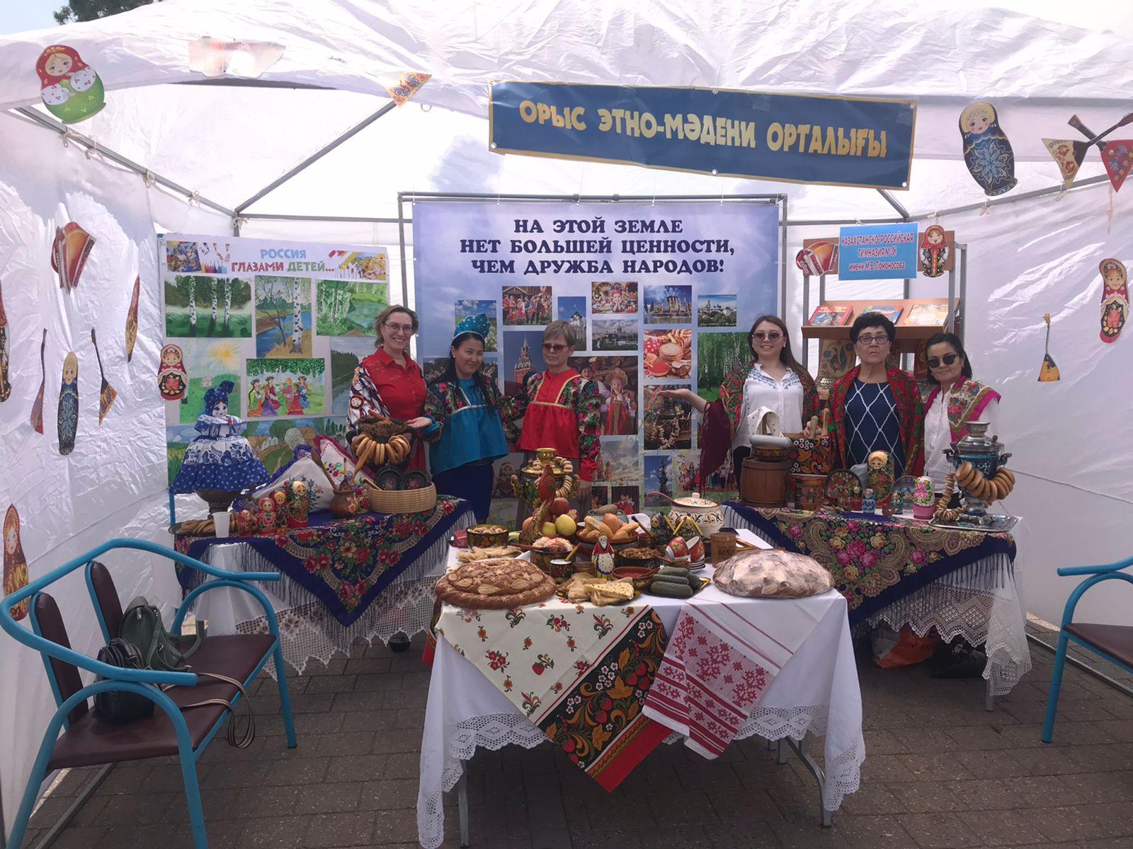 Выставочный павильон гимназии на 1 мая -День единства народов Казахстана. Казахстанско-Российская гимназия № 38 представила русский этнокультурный центр, на представленной выставке были предметы быта, кулинарные изделия, учебники русских философов, рисунки учеников.