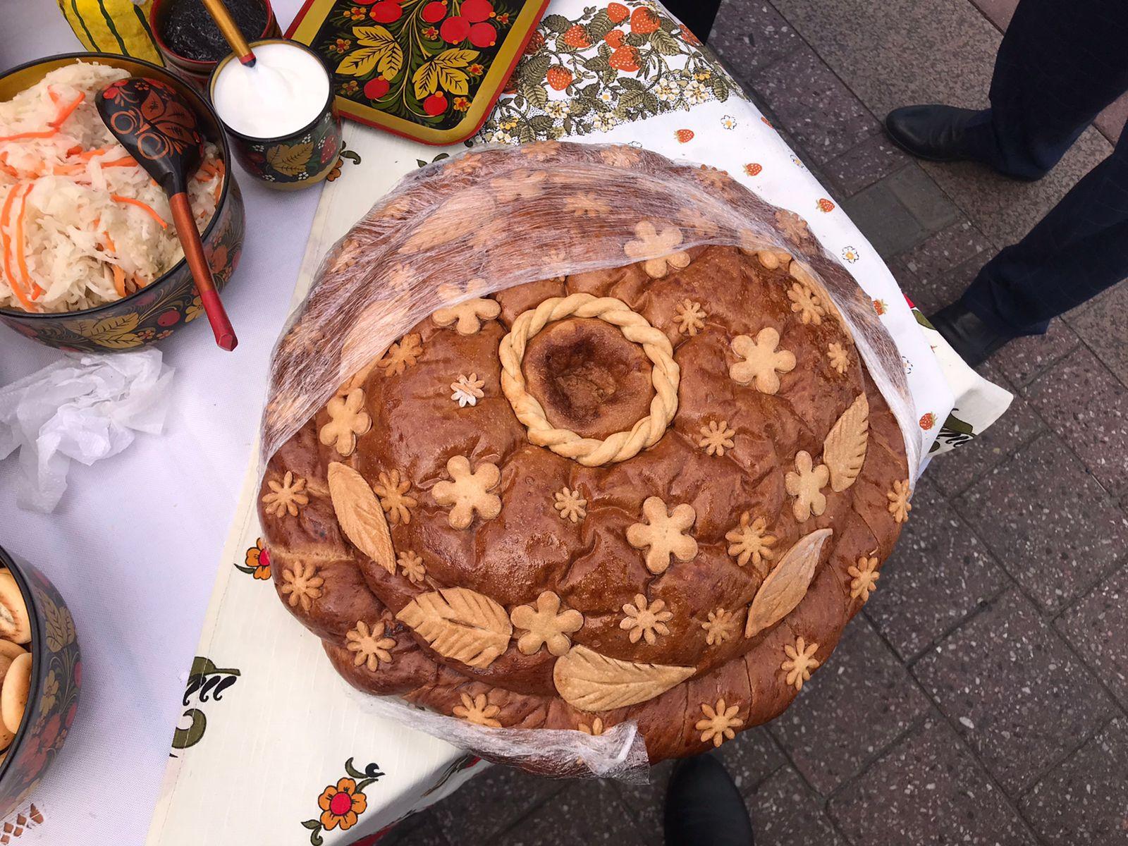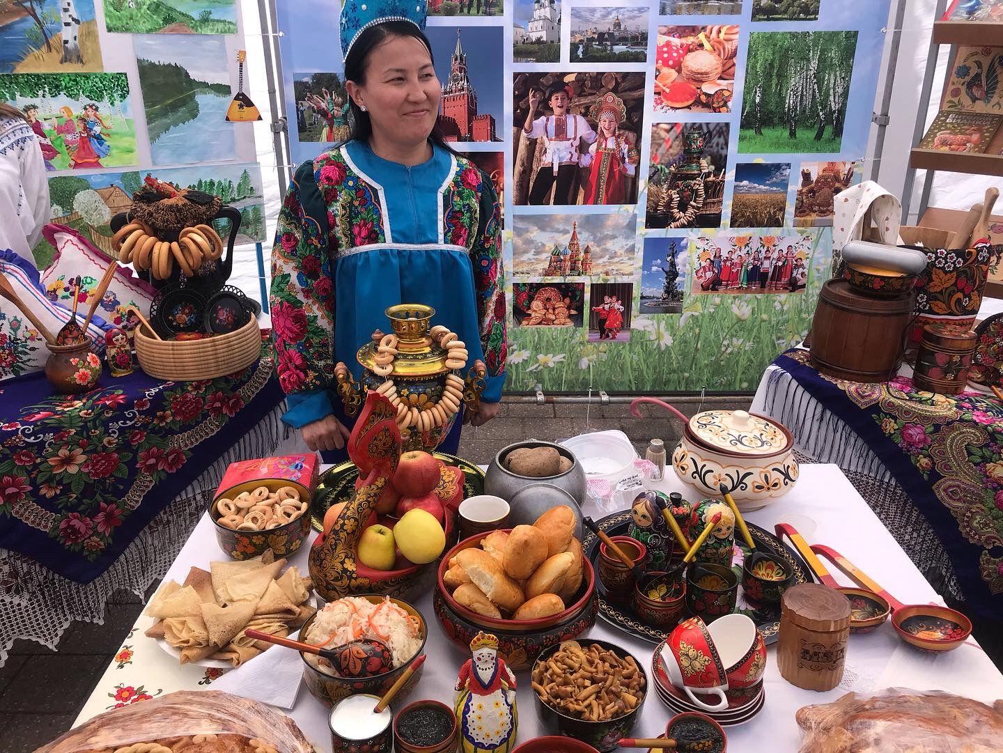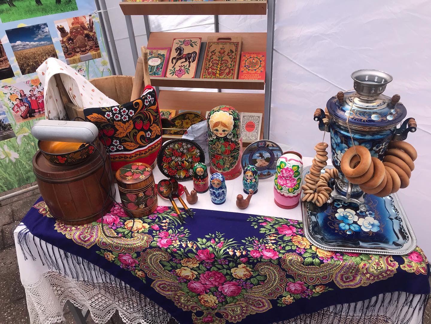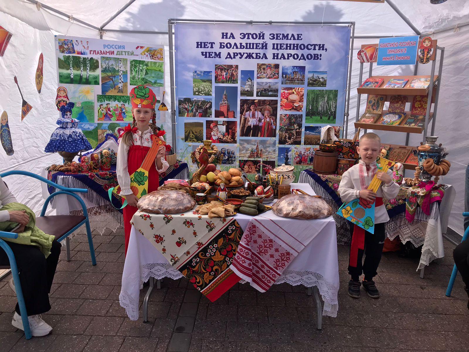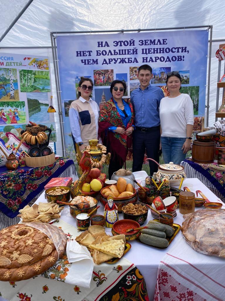 Выставочный павильон гимназии на 1 мая -День единства народов Казахстана. Казахстанско-Российская гимназия № 38 представила русский этнокультурный центр, на представленной выставке были предметы быта, кулинарные изделия, учебники русских философов, рисунки учеников.