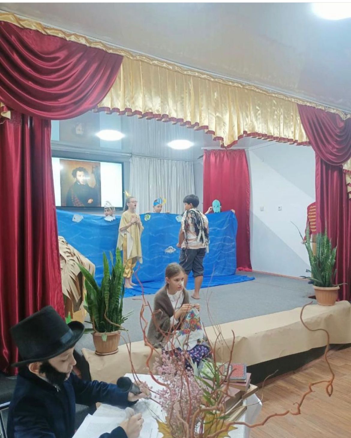 5-сынып оқушылары сахнада А.С. Пушкиннің"Балықшы мен балық "туралы әдеби ертегі ұсынды. Жас актерлер Ұлы Ақынның,мейірімді қарттың,ашулы Кемпірдің,сүйкімді балықтың және басқа кейіпкерлердің бейнесінде жанды музыкалық сүйемелдеуімен жақсы сахналады.