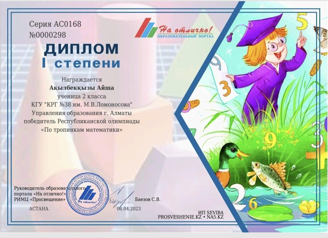 2 «Ж» сынып оқушысы Ақылбекқызы Айша «Математика» және «Әдебиет» пәндері бойынша Республикалық олимпиадада жоғары көрсеткіш көрсеткені үшін 1 және 2 д