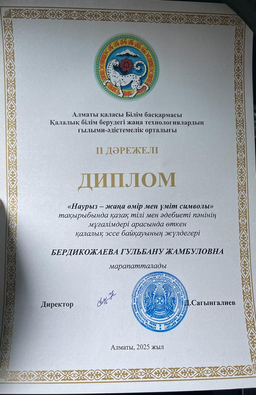 “Наурыз- жаңа өмір мен үміт символы” атты мұғалімдер арасындағы қалалық эссе байқауынан қазақ тілі және әдебиет пәні мұғалімі Бердикожаева Гульбану Жамбуловна II орынмен марапатталды!Еңбегіңізге жеміс, жұмысыңызға табыс тілейміз!