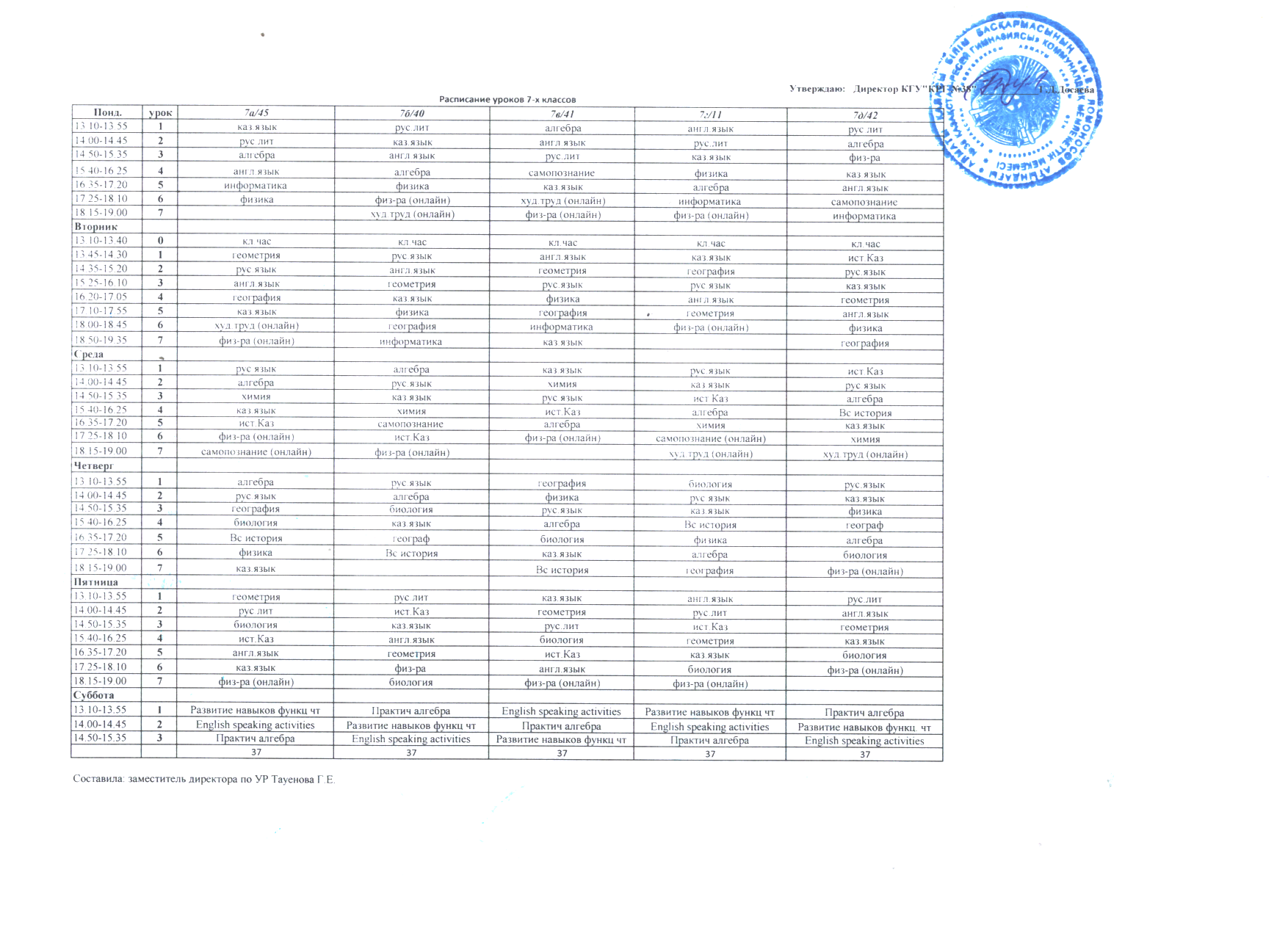 09 қазан 2021 0 1 2 3 4 5 2021-2022 оқу жылына арналған 7-сынып сабақ кестесі Расписание уроков 7-х классов на 2021-2022 учебный год