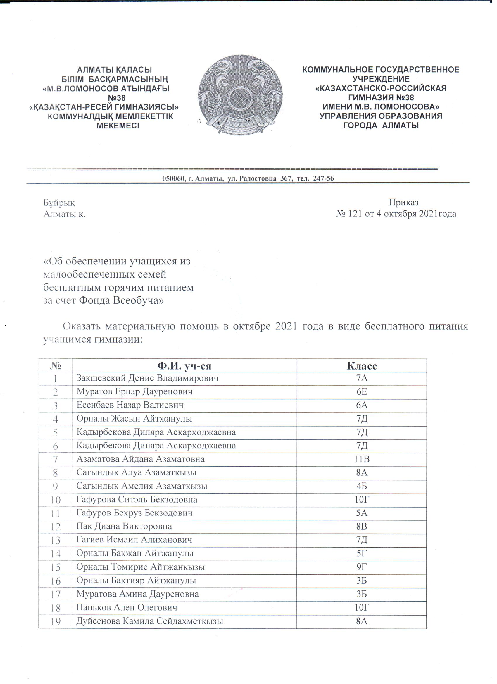 08 қазан 2021 0 1 2 3 4 5 Аз қамтылған отбасылардан шыққан оқушыларды жалпыға бірдей білім беру қоры есебінен тегін ыстық тамақпен қамтамасыз ету туралы бұйрық