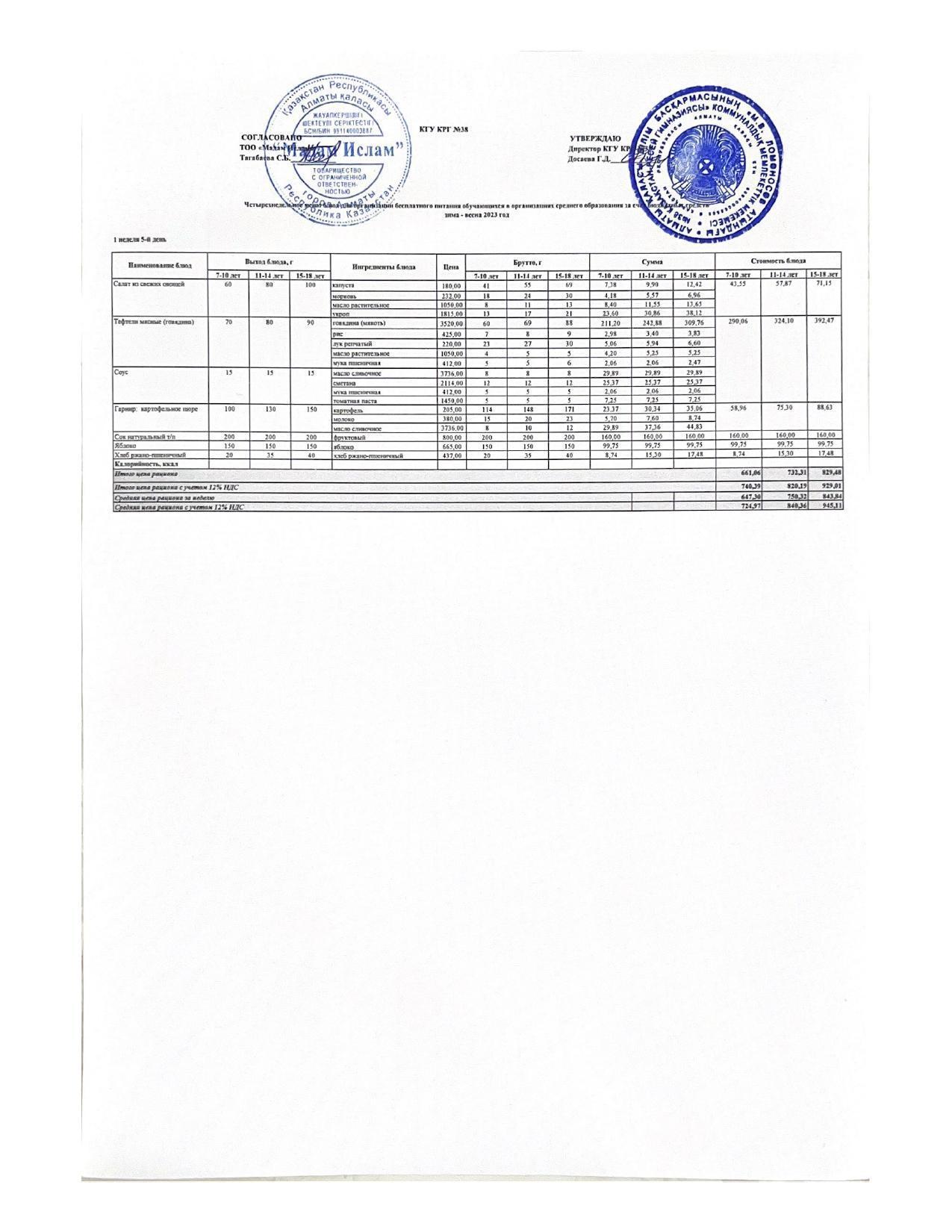 Ас мәзірі 7.04.2023жыл 1апта 5күн