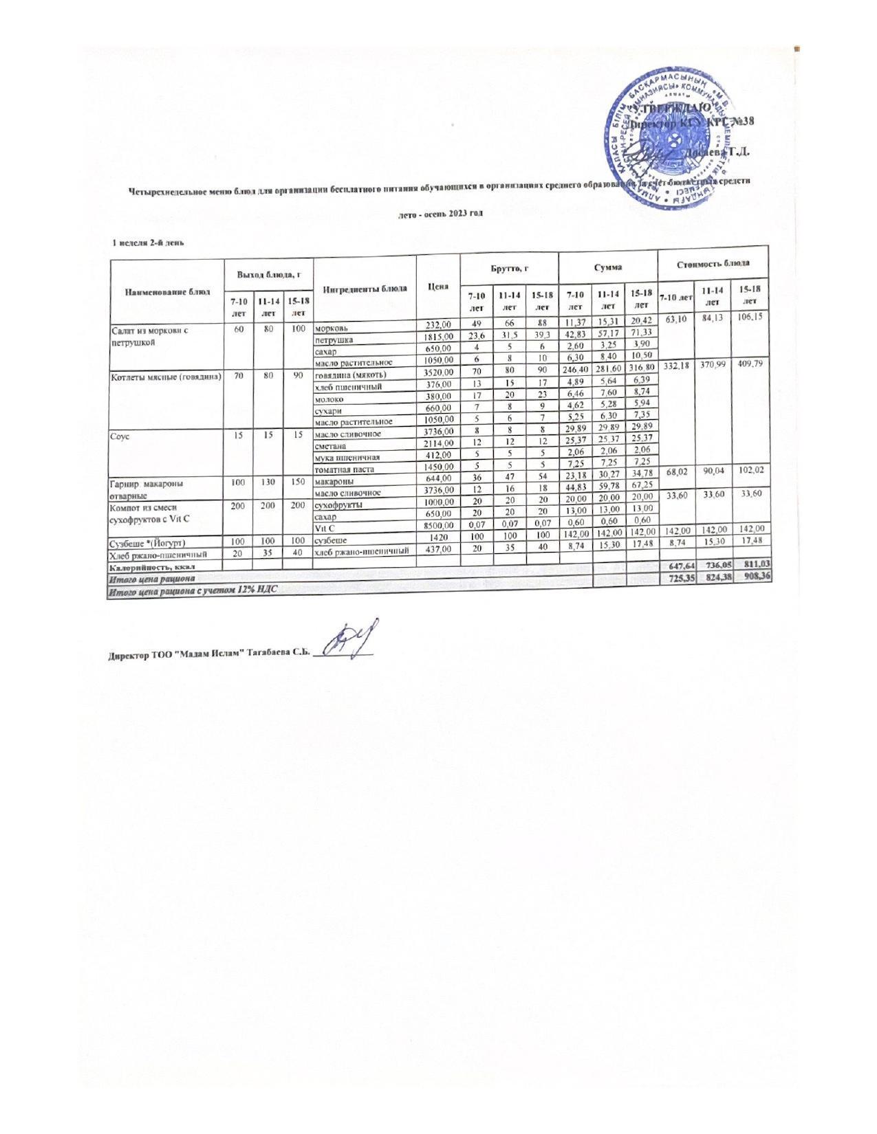 » Ас мәзірі 05.09.2023ж 1апта 2 күн