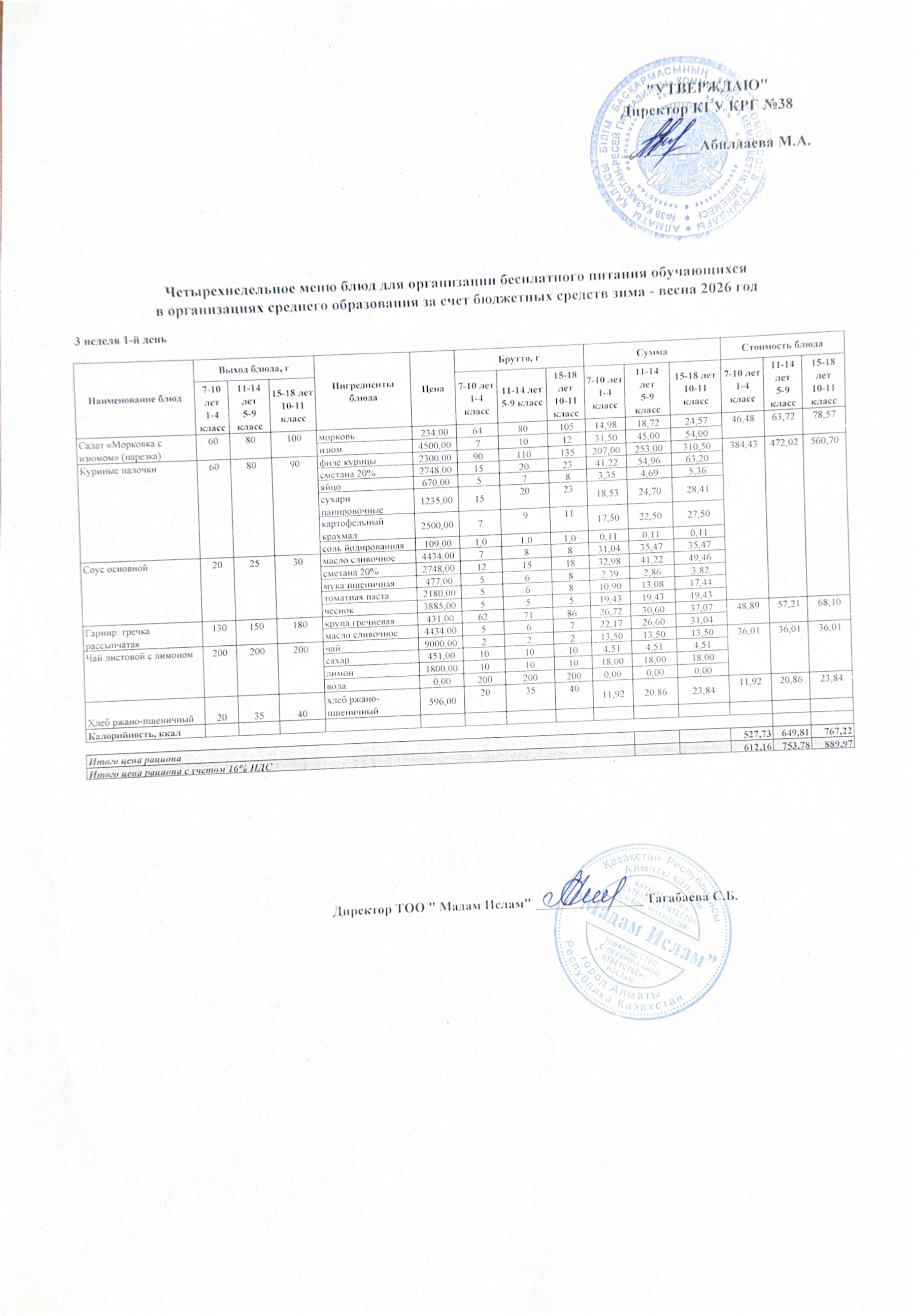 Ас мәзірі 2.02.2026ж 1апта 1күн